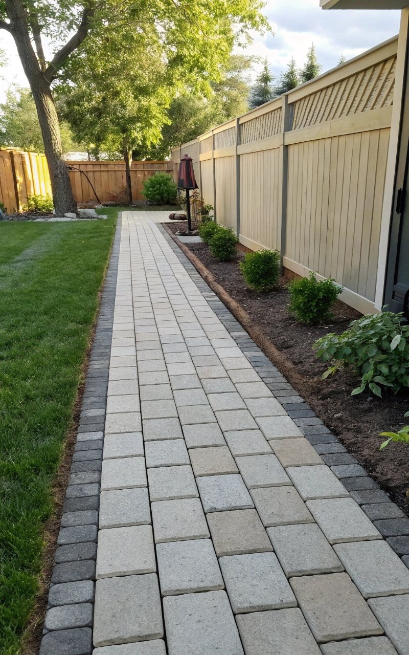 I turned an unused strip along the fence into a slim paver patio, and it made that awkward space feel intentional. The long layout works well in tight yards. It creates a useful walkway or seating zone. The footprint stays affordable. It’s simple, but smart. Pro Tip: Use rectangular pavers for easier alignment.