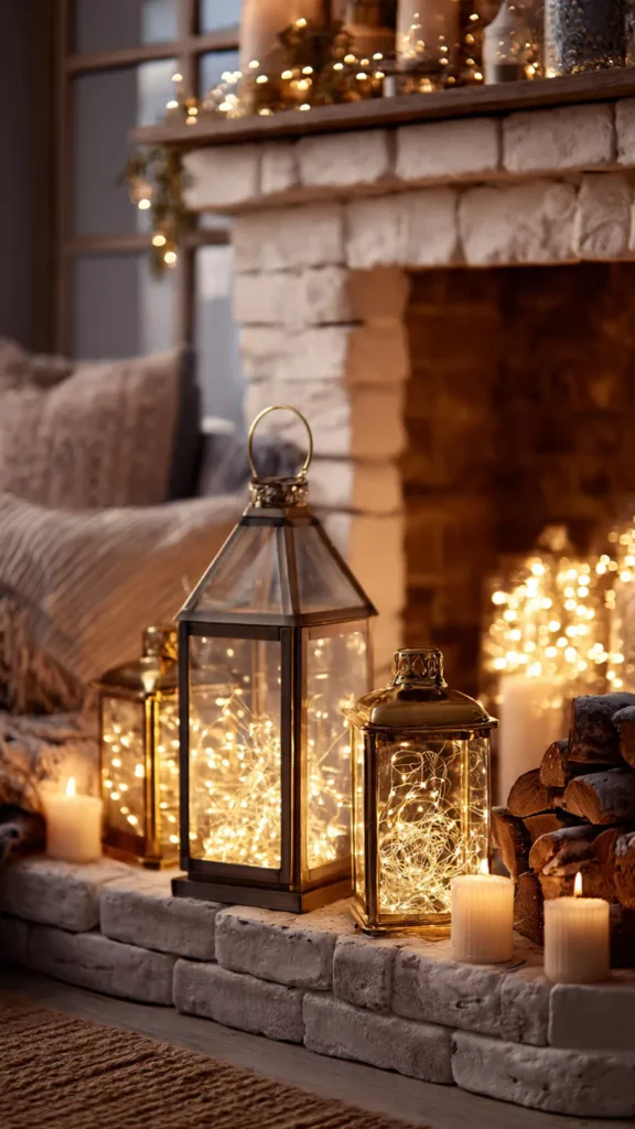 Lanterns filled with candles or fairy lights create a timeless, cozy mood. Their soft glow adds charm even when the fire is off. I love how lanterns make the hearth feel welcoming from every angle. Isn’t layered lighting so inviting?