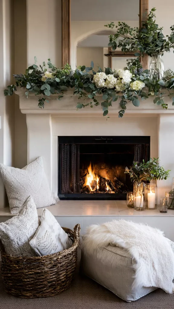 Dried eucalyptus, pine branches, or winter florals add life and color without overwhelming the hearth. I love how greenery creates a quiet connection to the season. Doesn’t nature always make interiors feel more alive?