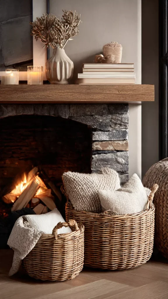 Baskets are perfect for storing blankets, books, or firewood while adding texture. Their earthy, handmade feel makes a hearth instantly more inviting. I love how woven materials soften the space visually. Isn’t texture the secret ingredient to cozy decor?
