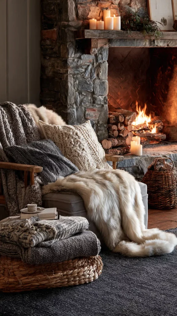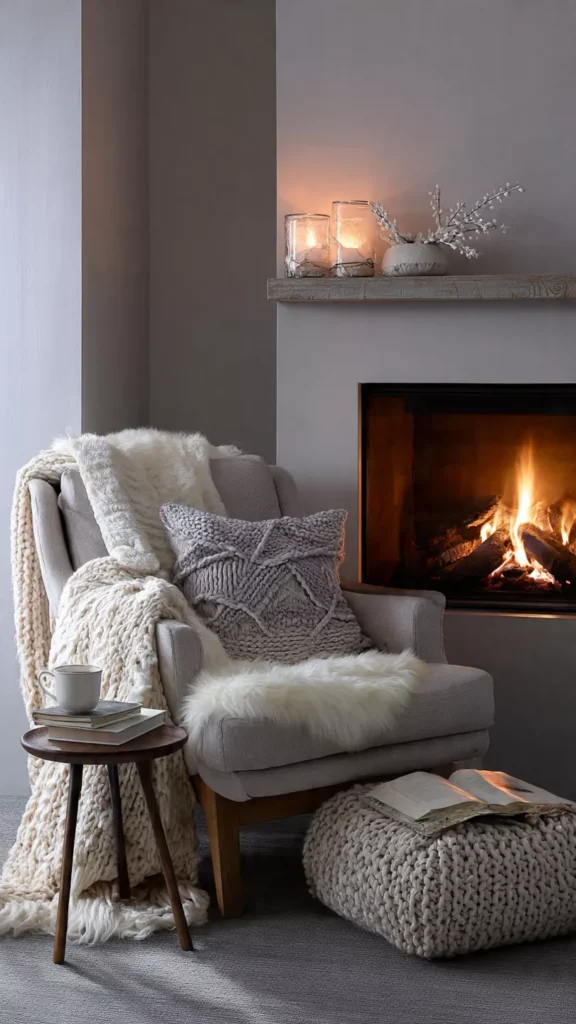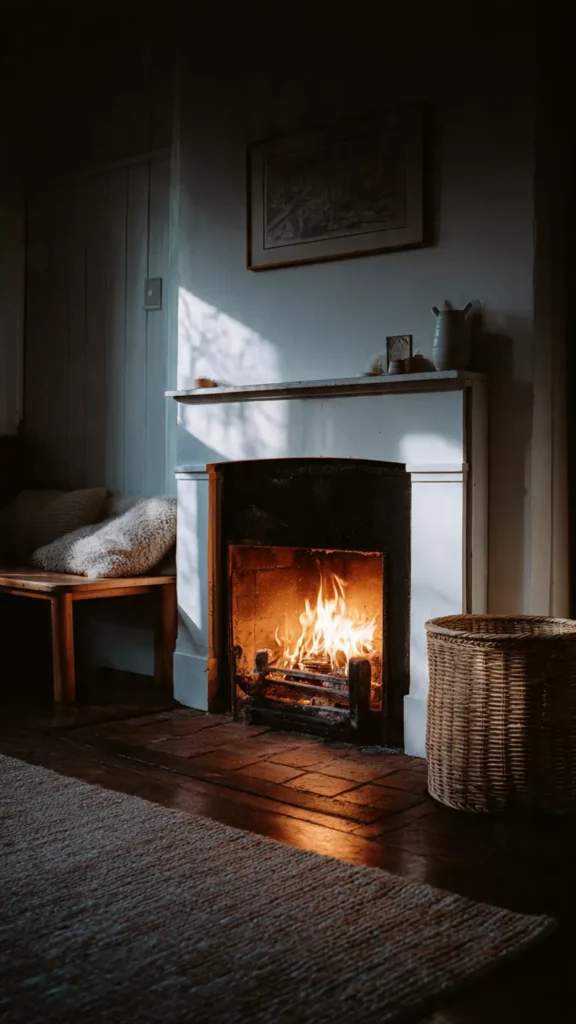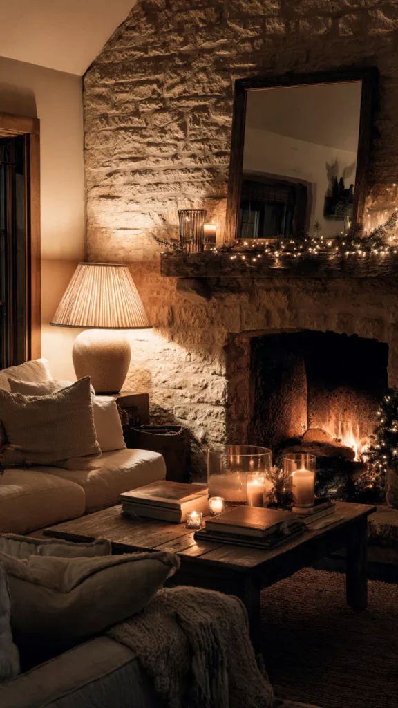 Table lamps, floor lamps, or even subtle string lights layered with the fireplace glow create depth and warmth. The room feels softly illuminated rather than harshly lit. I’ve always believed cozy spaces depend on gentle lighting. Doesn’t warm glow change everything?