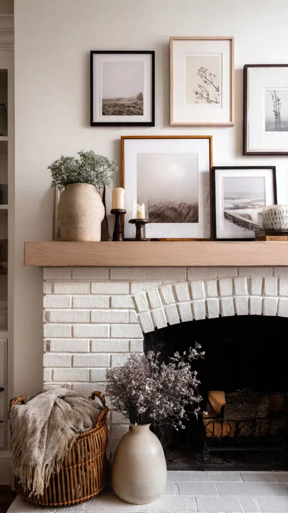 Layered frames feel casual and collected, adding warmth without formality. Soft landscapes, winter scenes, or neutral art work beautifully. I always think art makes the hearth feel more personal. Doesn’t storytelling live in these little touches?