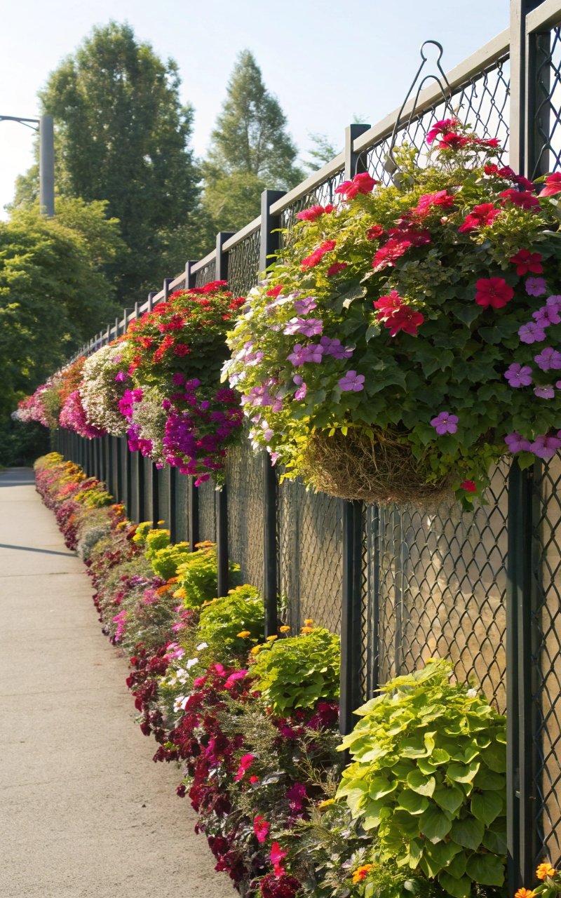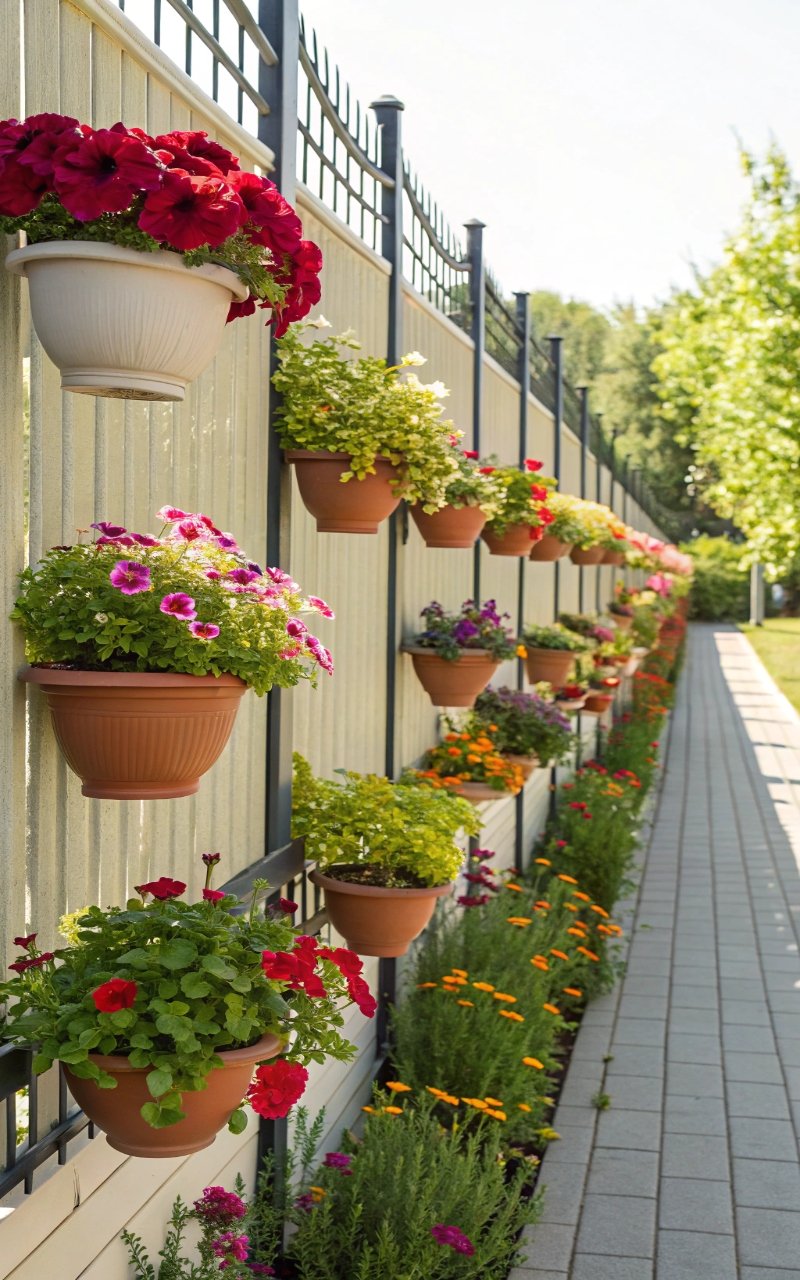 The first time I added hanging pots to my fence, it instantly felt more vibrant. The layered plants and vertical arrangement create depth and color. I love how it turns a flat surface into something alive. It’s simple but eye-catching. Have you ever noticed how greenery changes everything? This one definitely does.
