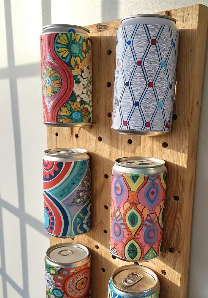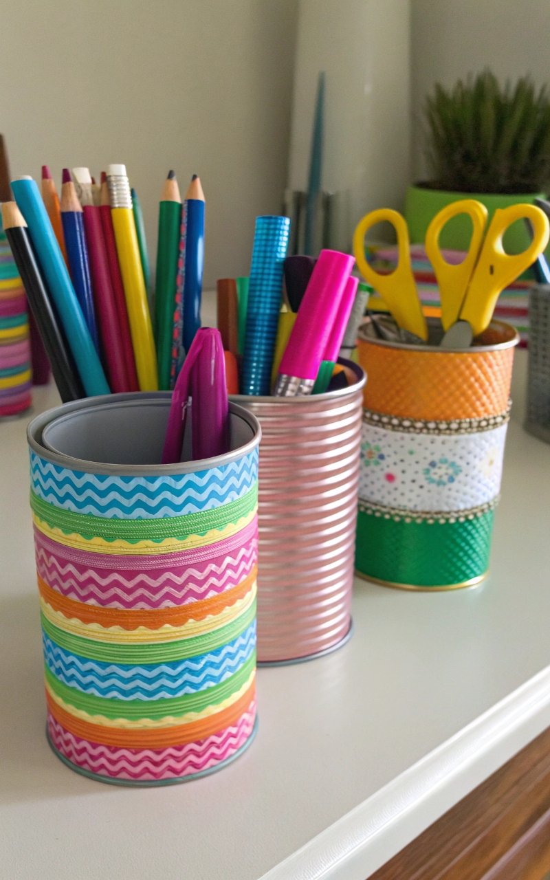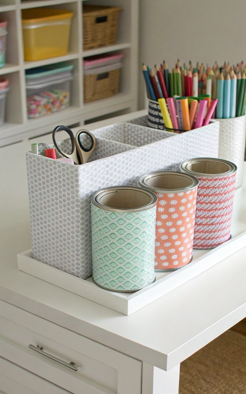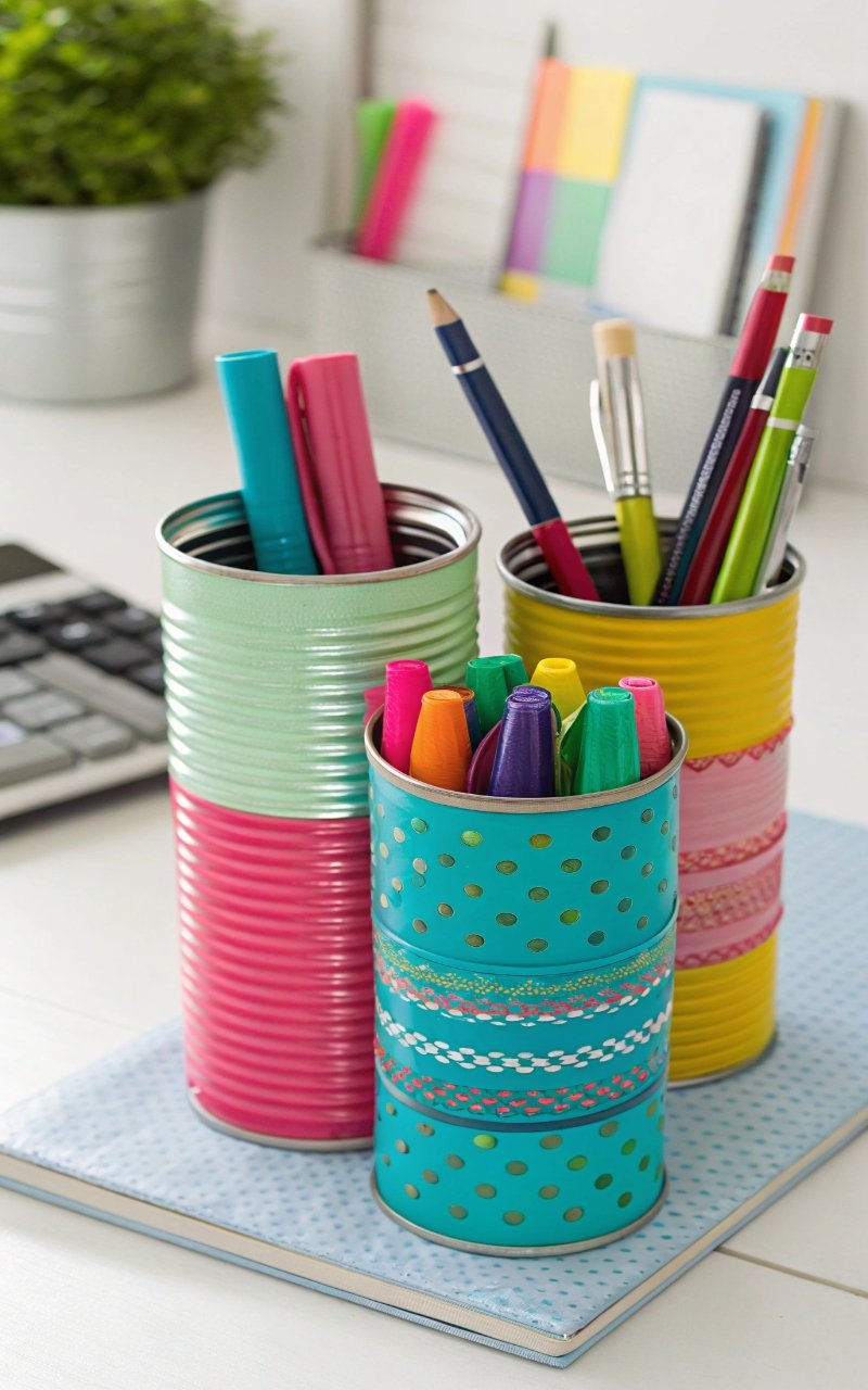 Decorated cans make great storage containers. I love using them for craft supplies or kitchen tools. The space looks organized and creative. Nothing feels cluttered. Doesn’t storage look better when handmade? It’s practical decor.