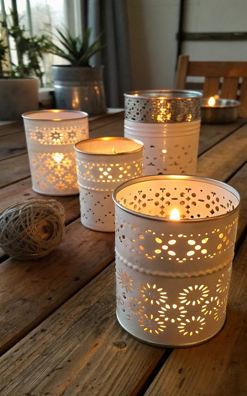 Cans can easily turn into rustic candle holders. I love cutting decorative patterns into the sides. The glow becomes beautiful at night. Nothing feels boring. Doesn’t candlelight improve everything? It’s cozy decor.