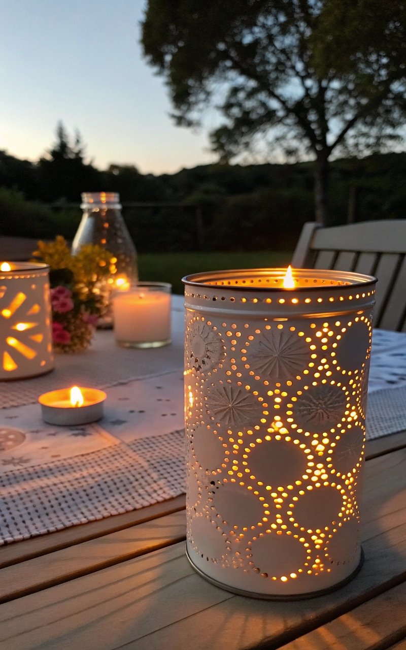 Lanterns made from cans glow beautifully at night. I love punching tiny patterns into the metal. The candlelight shines through the holes. Nothing feels ordinary. Doesn’t light create magic? It’s charming outdoor decor.
