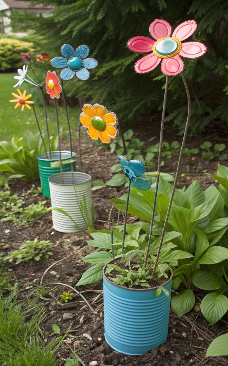 Flattened aluminum cans can become colorful flower shapes. I love painting them in bright colors. The garden feels playful and creative. Nothing feels plain. Doesn’t handmade art add charm? It’s a cheerful craft.