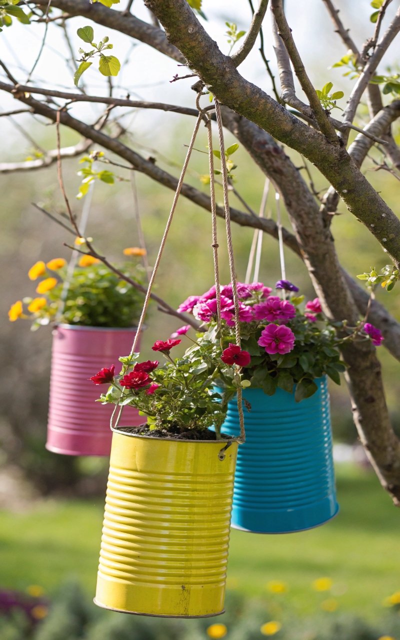 Painted cans hanging from branches create playful garden decor. I love filling them with small flowers. The yard feels lively and colorful. Nothing looks dull. Doesn’t color brighten outdoor spaces? It’s charming.