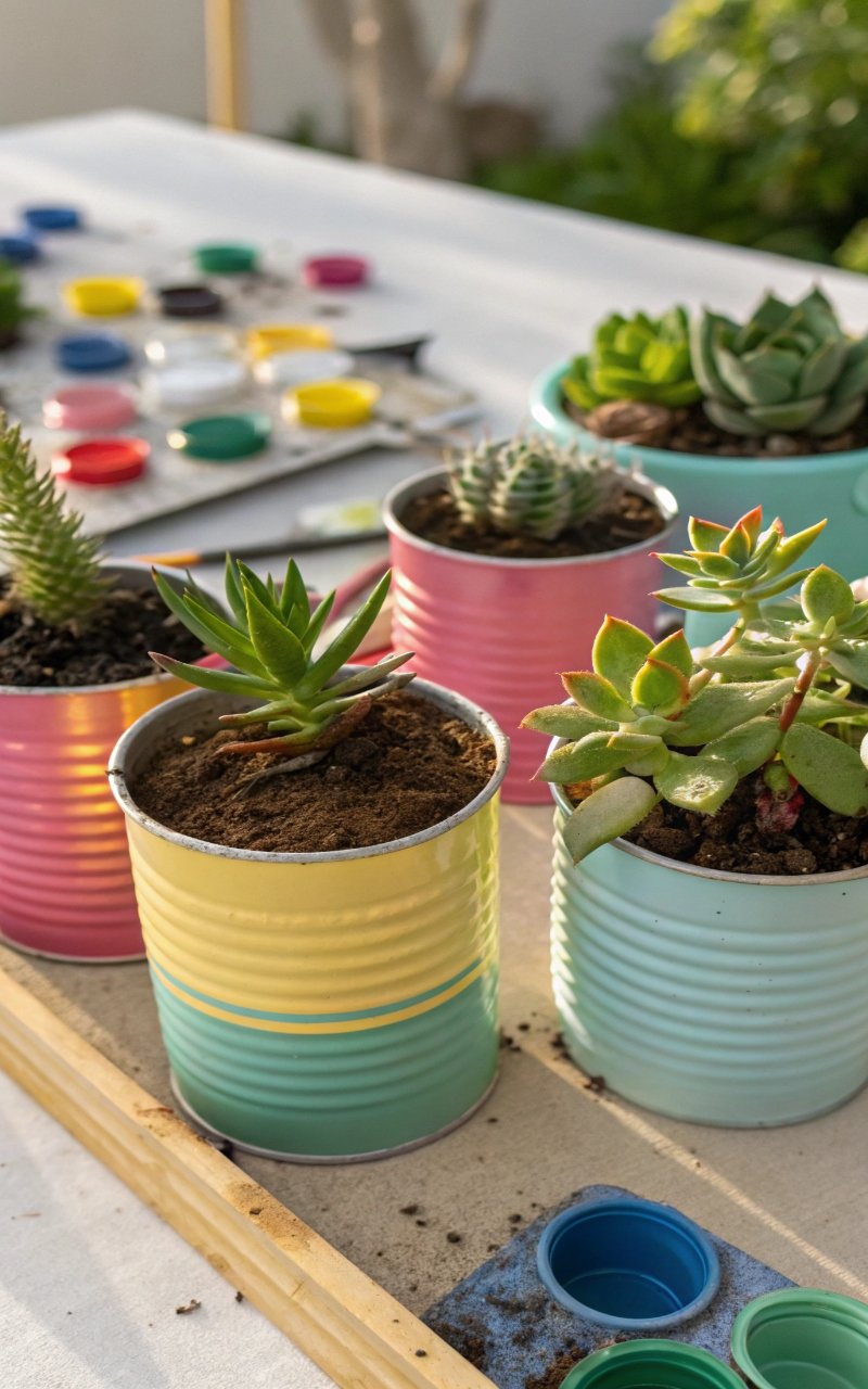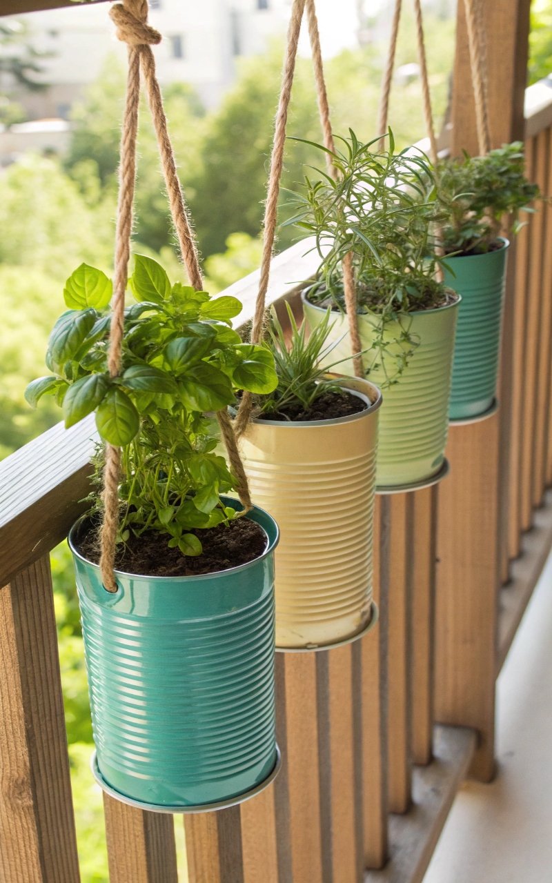 Aluminum cans make great hanging herb planters. I love painting them and attaching rope for suspension. The kitchen or balcony feels lively. Nothing looks plain. Doesn’t greenery brighten any space? It’s both decorative and practical.