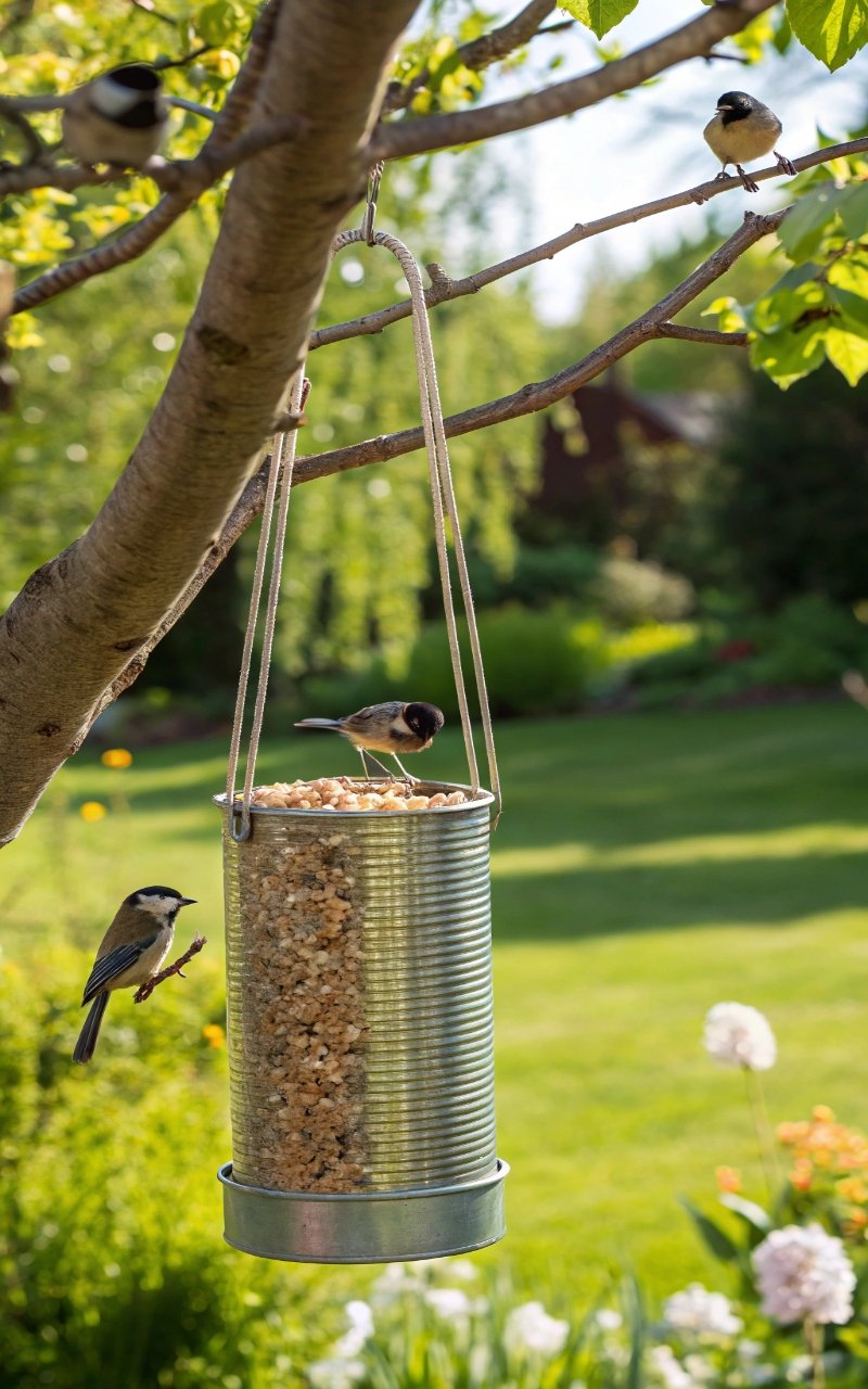 Cans can become simple bird feeders. I love hanging them in the garden with seeds inside. Birds visit throughout the day. Nothing feels more peaceful. Doesn’t nature add joy? It’s a rewarding project.