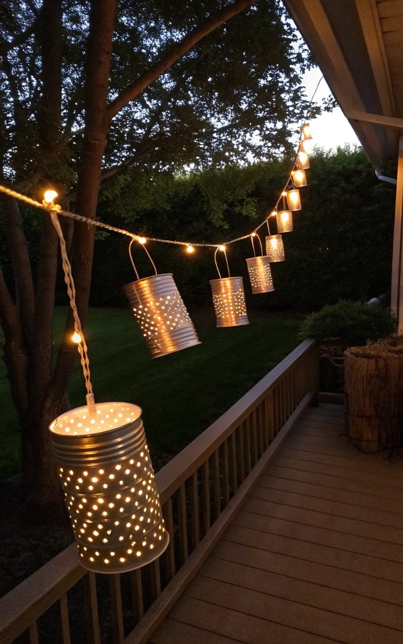 Small can lanterns can be strung together as decorative garlands. I love how the light sparkles through them. The space feels festive. Nothing feels dull. Doesn’t lighting create atmosphere? It’s beautiful outdoor decor.