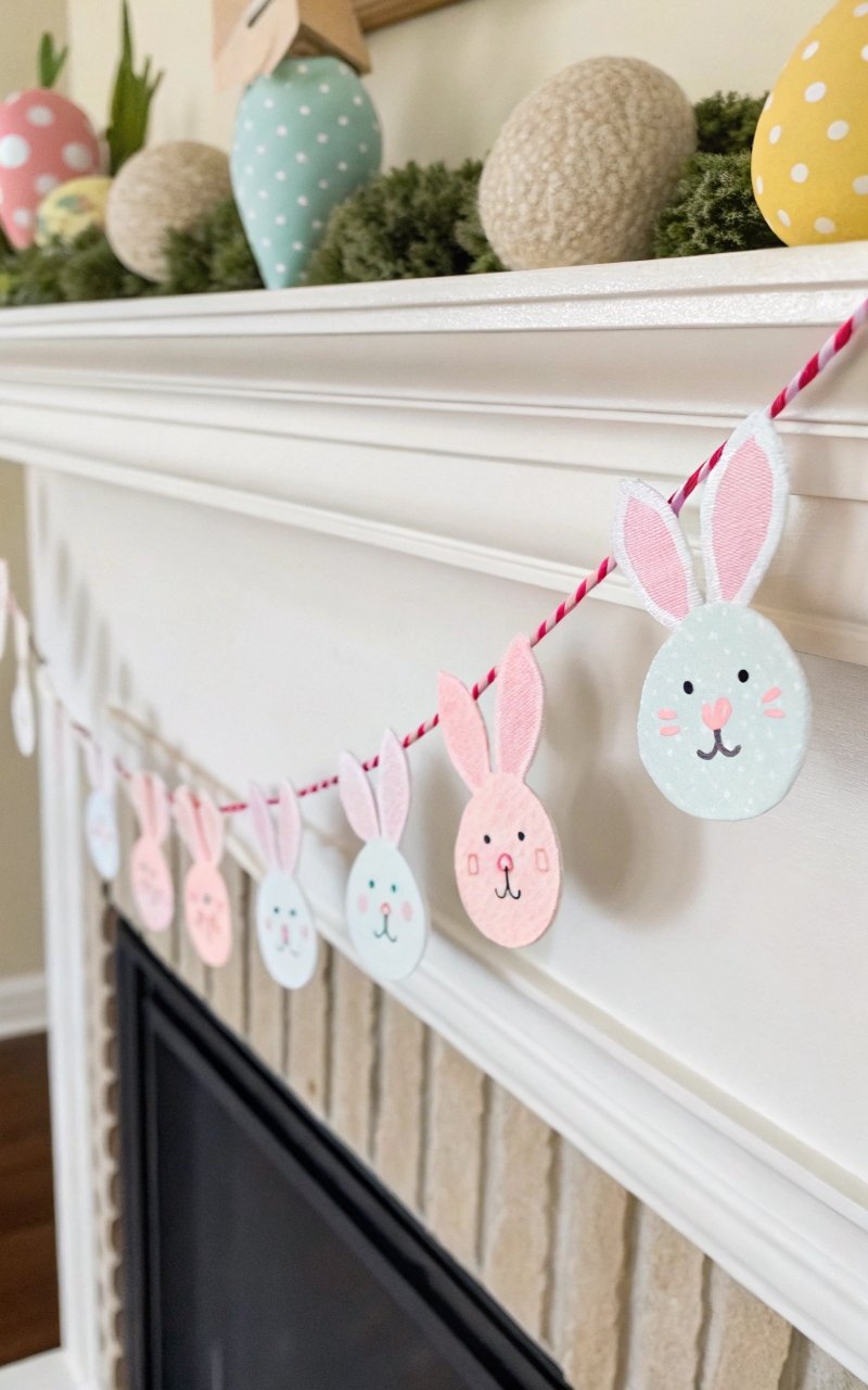 A bunny garland adds a playful touch without taking up much space. I love cutting bunny shapes from cardstock or felt and stringing them across a mantel or shelf. The room feels festive instantly. Nothing feels dull. Doesn’t a little seasonal detail make a big difference? It totally does.