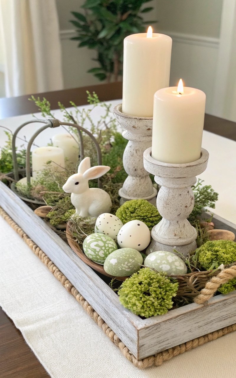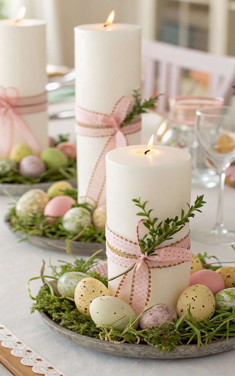 Decorated candles can add such a cozy seasonal touch. I love wrapping pillar candles with ribbon or styling them alongside eggs and greenery. The setup feels warm and elegant. Nothing feels too complicated. Doesn’t candlelight make every display look better? Pretty much always.