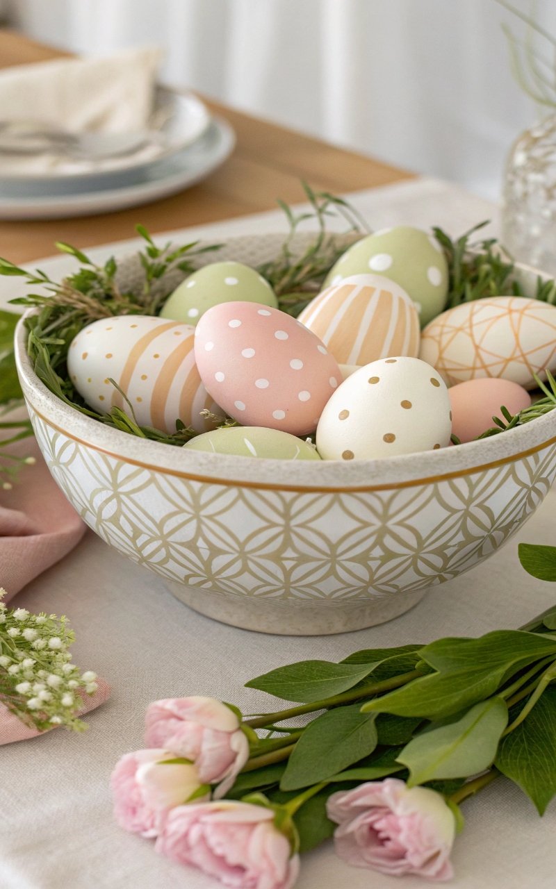 A bowl of painted eggs makes such an easy centerpiece. I love mixing soft pastel shades and simple patterns for a relaxed look. The display feels cheerful and seasonal. Nothing feels overdone. Doesn’t a simple bowl of color make a table feel complete? It really does.