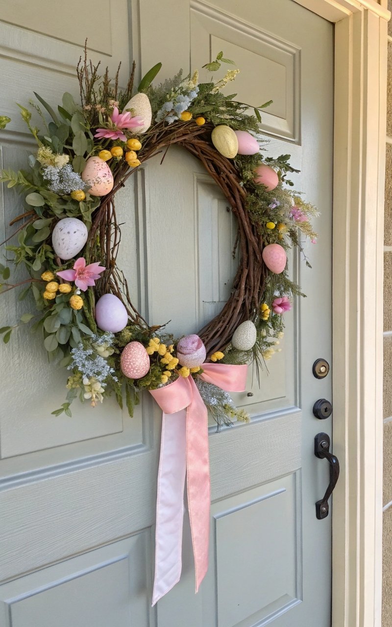 An Easter wreath instantly brightens the front door. I love using faux flowers, pastel eggs, and soft ribbon to make it feel festive. The whole entry looks more cheerful right away. Nothing feels plain. Doesn’t a wreath always make the season feel official? It’s a classic project.