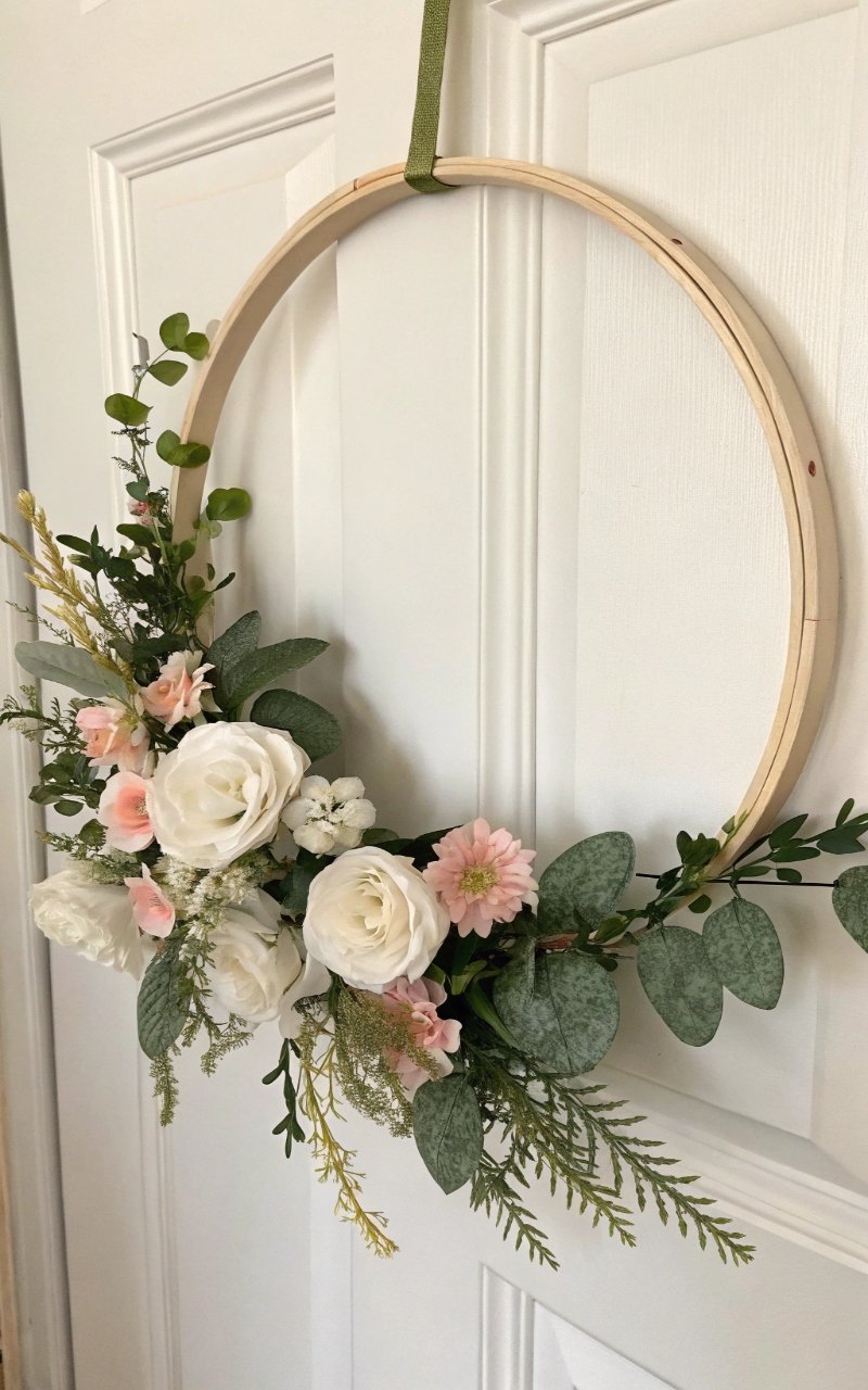 A floral hoop is one of those decorations that looks more expensive than it is. I love wrapping part of an embroidery hoop with faux flowers and greenery. The result feels airy and elegant. Nothing feels too heavy. Doesn’t minimal floral decor always look a little chic? It really does.