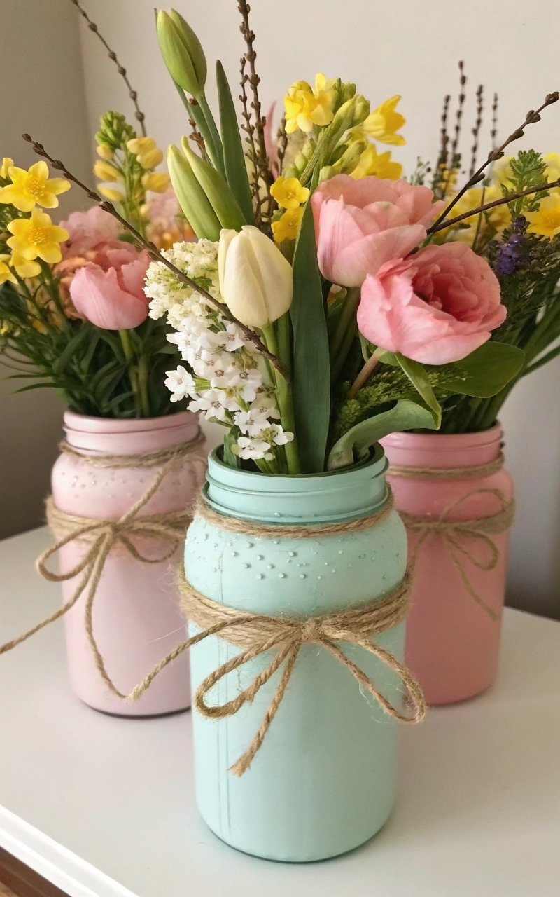 Mason jars make adorable Easter vases with almost no effort. I love painting them in pastel colors and filling them with spring flowers. The setup feels sweet and cozy. Nothing looks too formal. Doesn’t simple decor usually end up being the cutest? It often does.