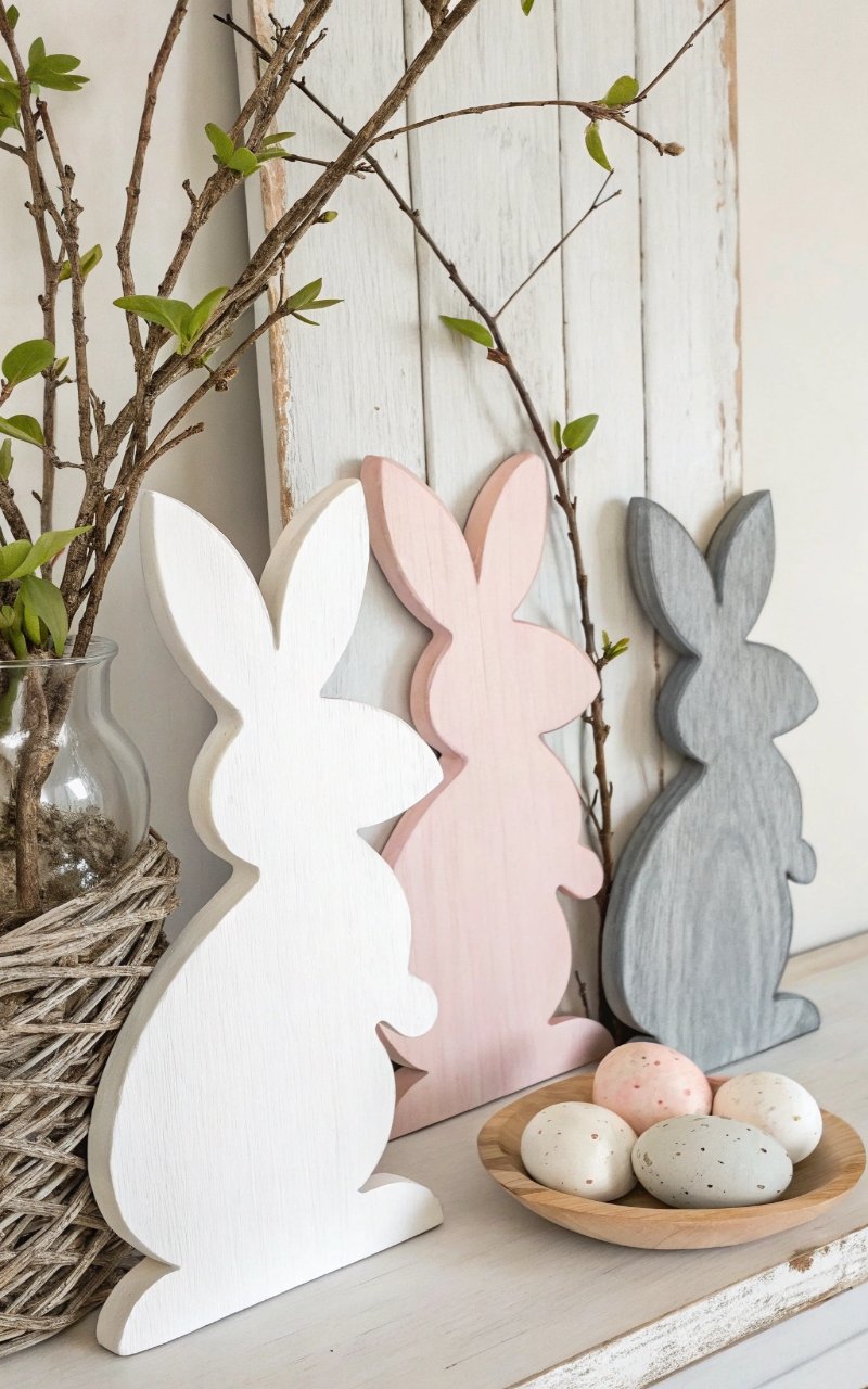 Wooden bunny shapes are simple but really charming. I love painting them in white, blush, or soft gray for a clean spring look. The decor feels playful without being overly cute. Nothing feels cluttered. Doesn’t painted wood always bring a little rustic charm? Definitely.