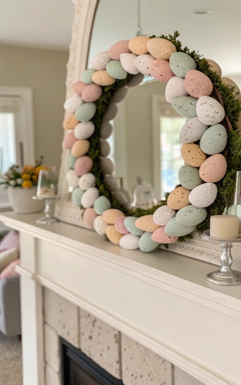 A pastel egg wreath works beautifully inside the home too. I love hanging one above a mantel, on a mirror, or even in the dining area. The decor feels soft and seasonal. Nothing feels too loud. Doesn’t repeating a seasonal theme in different rooms make the whole home feel more cohesive? It really does.