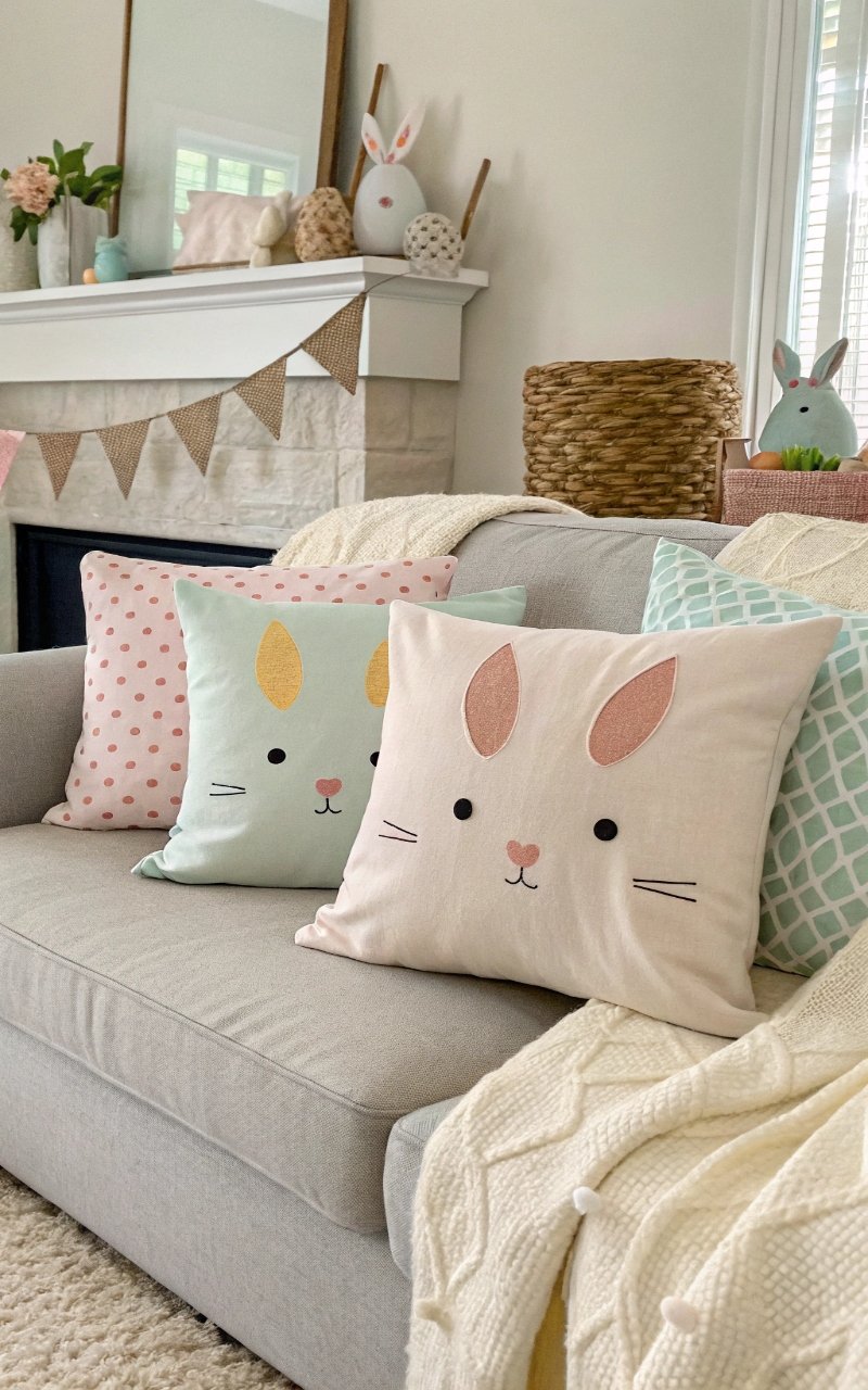 Bunny-themed pillow covers instantly make a room feel more festive. I love using simple fabric paint or iron-on designs for an easy update. The space feels softer and more playful. Nothing feels too serious. Doesn’t seasonal fabric make a room feel refreshed? It does.