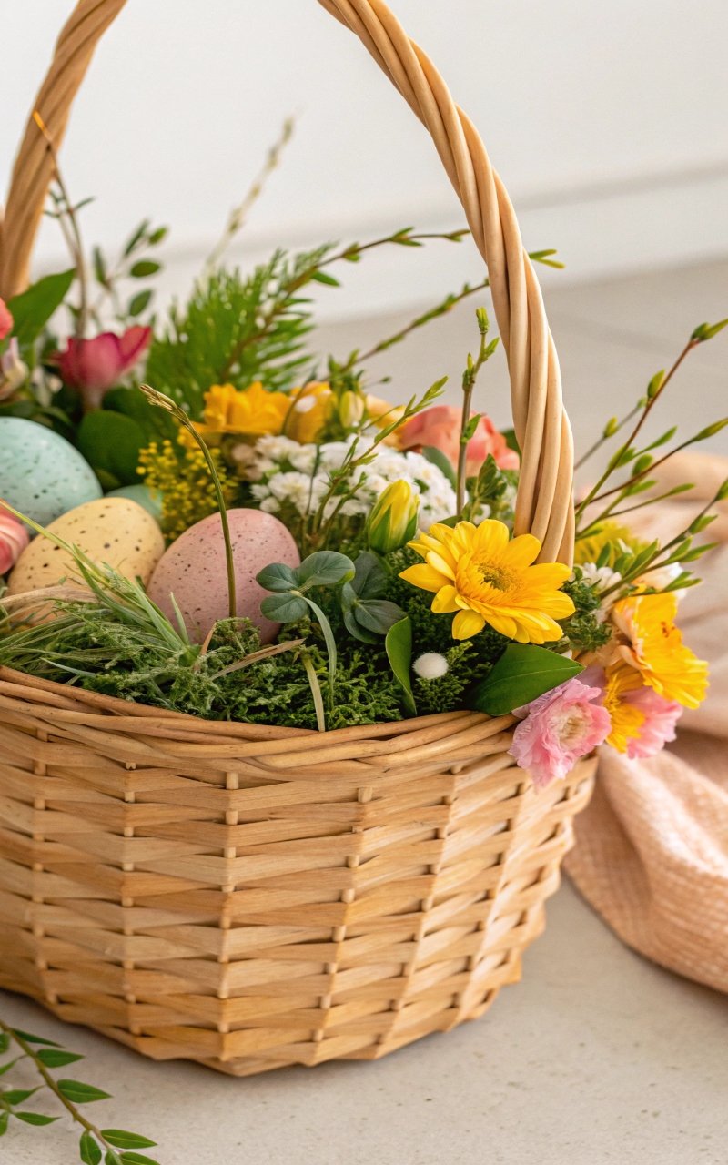 An Easter basket doesn’t have to be just for candy. I love filling one with flowers, greenery, and a few decorative eggs for a cozy spring display. The arrangement feels charming and relaxed. Nothing feels too polished. Doesn’t a basket always add warmth? It really does.