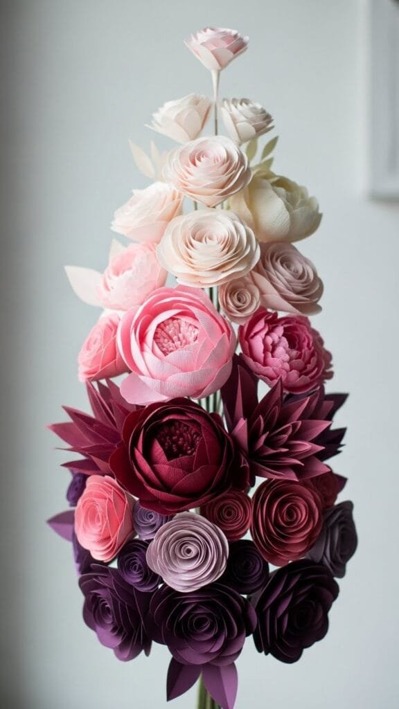 An ombre bouquet shifts from light to dark shades of one color for a dramatic, artistic effect. I love how it feels modern and stylish. The gradual color change is visually stunning. It turns paper flowers into something extraordinary. Doesn’t color movement feel exciting? This bouquet is a showstopper.
