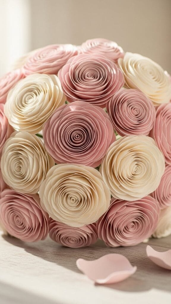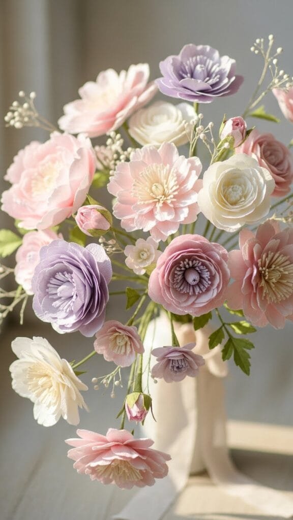 A mixed paper flower bouquet combines different shapes, sizes, and colors for a lively, textured look. I love how it feels abundant and joyful. Every bloom brings its own personality to the arrangement. It feels like a celebration of love in flower form. Doesn’t variety make things more exciting? This bouquet feels full of heart.