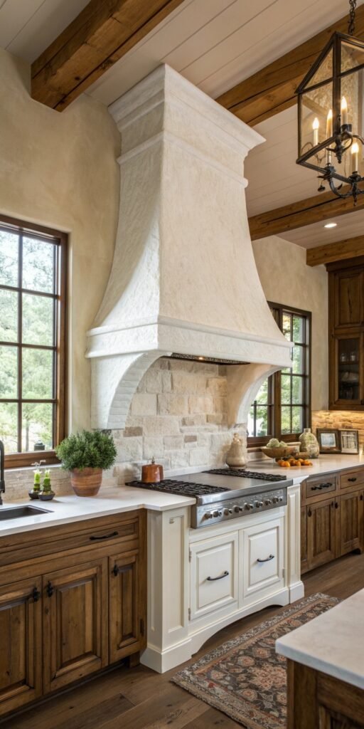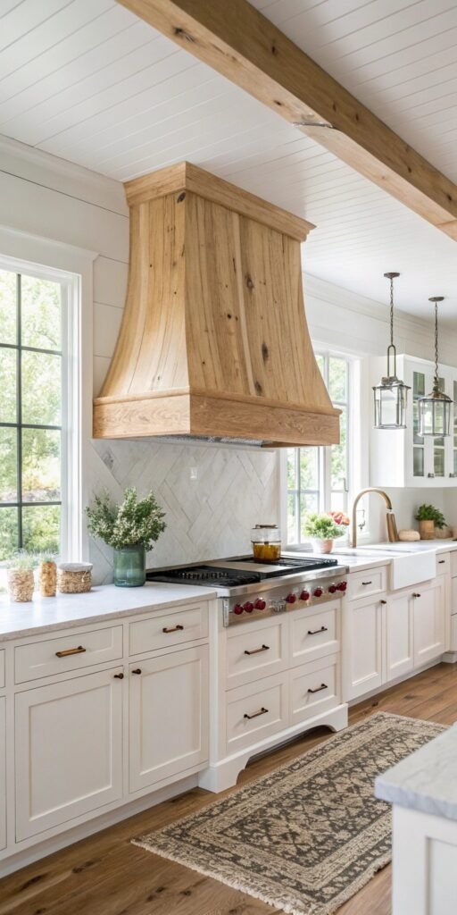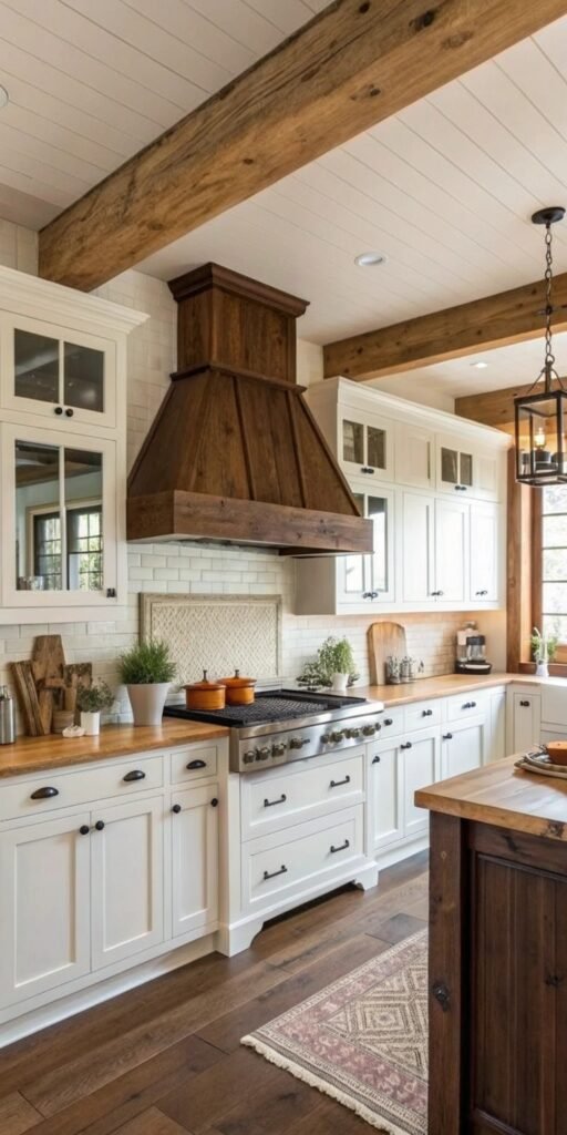 Wood beams add instant rustic charm. I love how they frame the hood and create architectural interest. The kitchen suddenly feels more grounded and warm. Nothing feels flat anymore. Doesn’t texture add depth? It’s perfect for farmhouse or cottage kitchens.