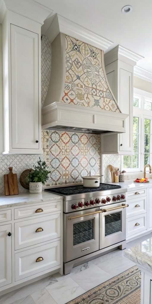 Adding tile to a hood cover makes it feel luxurious. I love extending backsplash tile onto the hood surface. The design feels cohesive and eye-catching. Nothing feels disconnected. Doesn’t pattern add personality? It’s a bold design choice.