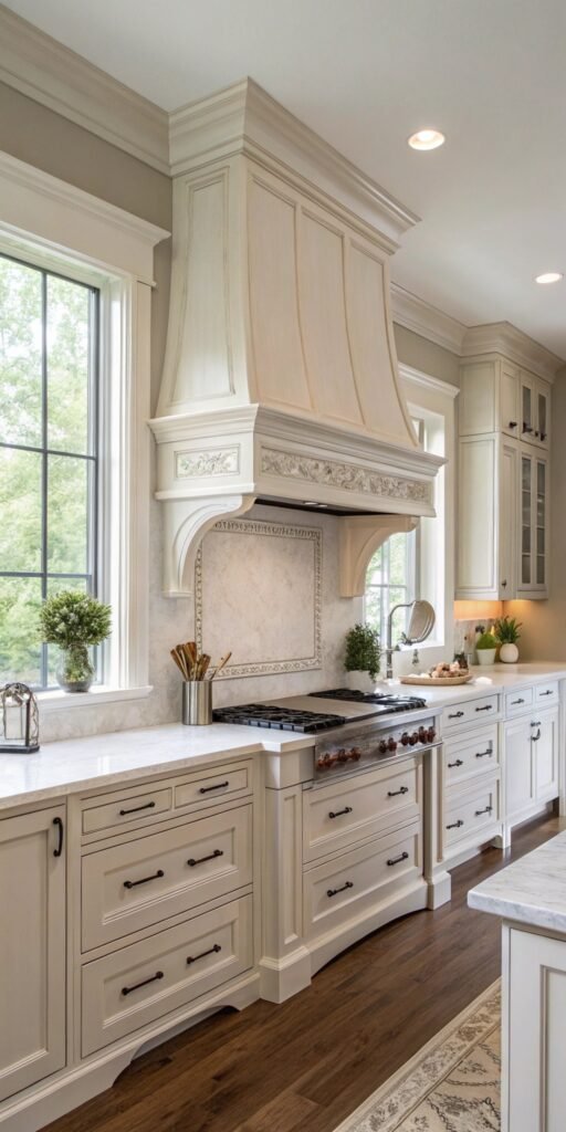 Decorative trim adds a custom-built appearance. I love small molding details that frame the hood. The design feels classic and refined. Nothing feels plain anymore. Doesn’t craftsmanship elevate a kitchen? It’s traditional and elegant.