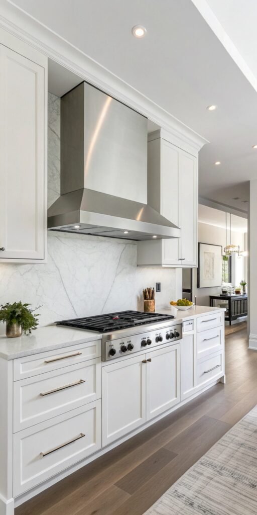 A clean box hood looks modern and sleek. I love the simple lines that keep the kitchen feeling uncluttered. The hood blends beautifully with contemporary cabinets. Nothing feels overly decorative. Doesn’t minimal design always feel sophisticated? It’s simple but striking.