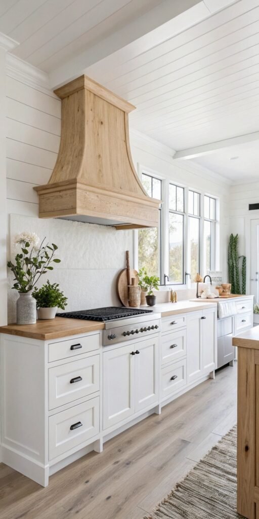 A natural wood hood instantly becomes a focal point. I love the warmth it brings to bright kitchens. The wood grain adds character and depth. Nothing feels sterile anymore. Doesn’t natural material always soften a space? It creates a cozy, high-end feel.