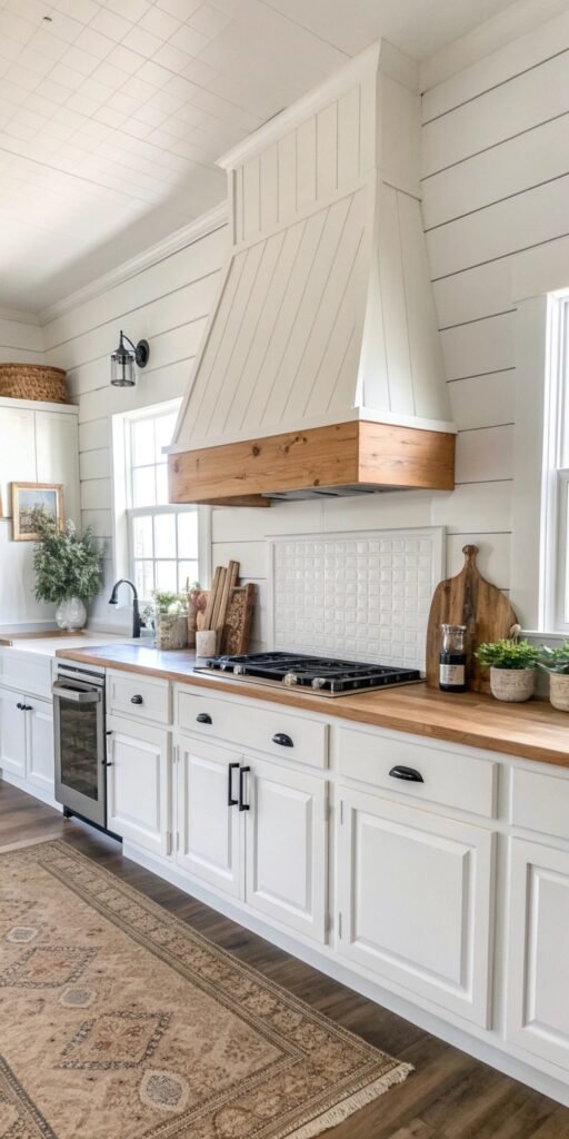 Shiplap instantly brings farmhouse warmth to a kitchen. I love how the horizontal boards add subtle texture while keeping the design clean. The hood feels like part of the cabinetry instead of an appliance. Nothing looks plain anymore. Doesn’t texture make a space feel cozy? It’s timeless and inviting.