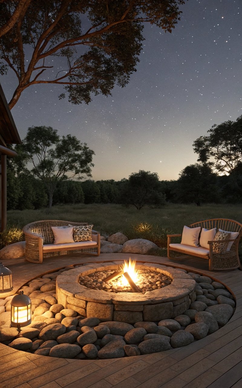 Surrounding a fire pit with river rocks created a cozy, finished area. The natural texture and defined space make it feel inviting. I love how it enhances the setup. It feels warm and social. Doesn’t a defined space feel more complete? This one definitely does.