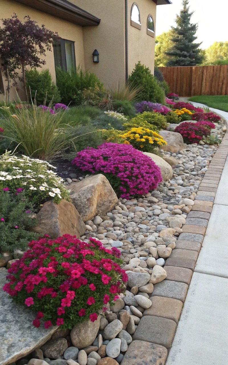 Adding rocks within flower beds created contrast and texture. The smooth stones and colorful plants make each element stand out more. I love how it breaks up greenery. It feels balanced and styled. Have you ever mixed textures like this? This one works beautifully.