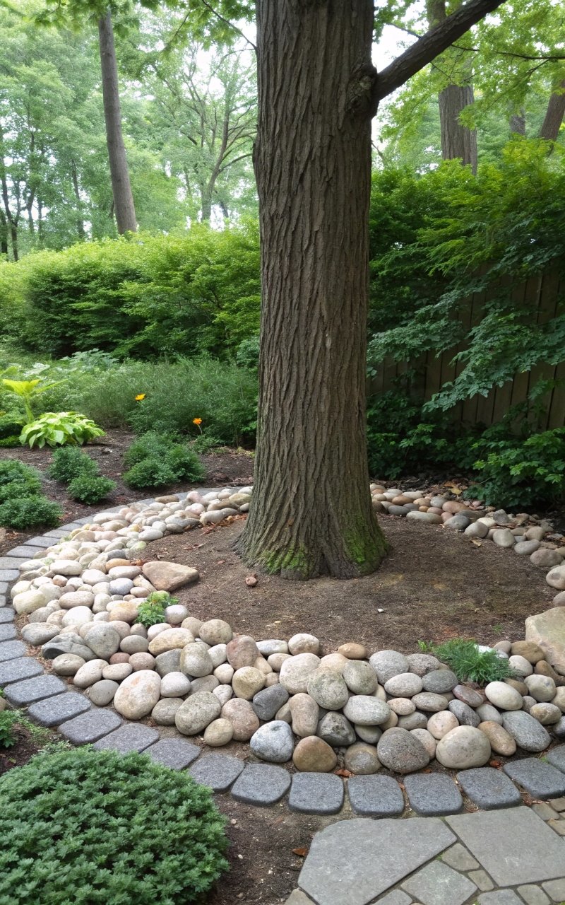 Placing river rocks around trees created a neat, finished look. The clean circle and natural texture make the base stand out. I love how it reduces maintenance. It feels tidy and intentional. Have you ever struggled with messy tree bases? This one fixes that easily.