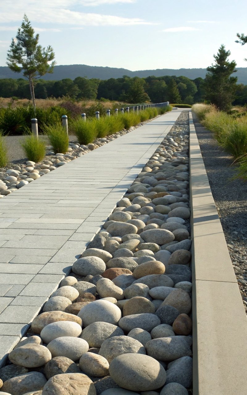 Using river rocks for drainage solved a practical problem beautifully. The permeable surface and natural flow help manage water effectively. I love how it looks good while serving a purpose. It feels smart and efficient. Have you ever solved a problem with style? This one does exactly that.