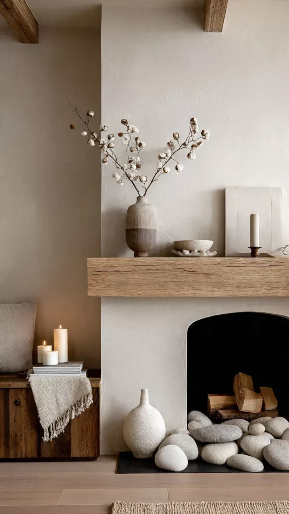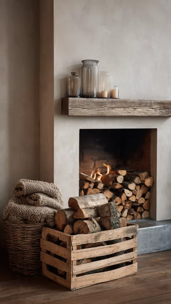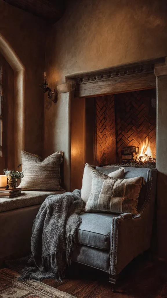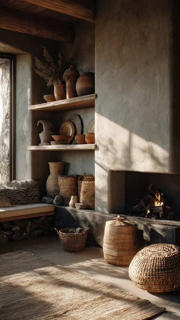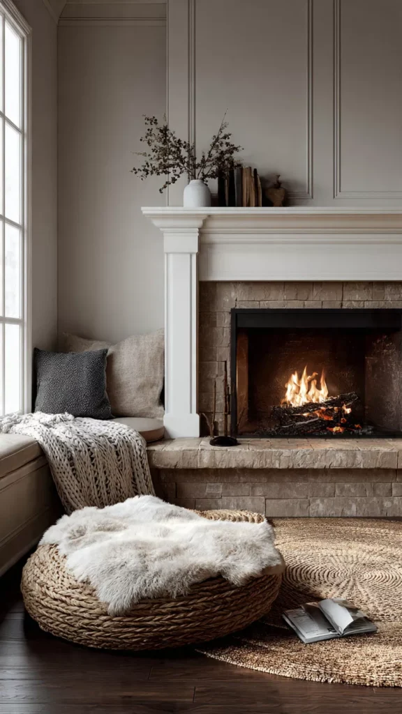 Stone, wood, clay, and woven elements bring warmth and earthiness to the hearth. I always find natural materials instantly make a room more welcoming. Isn’t texture everything in cozy design?