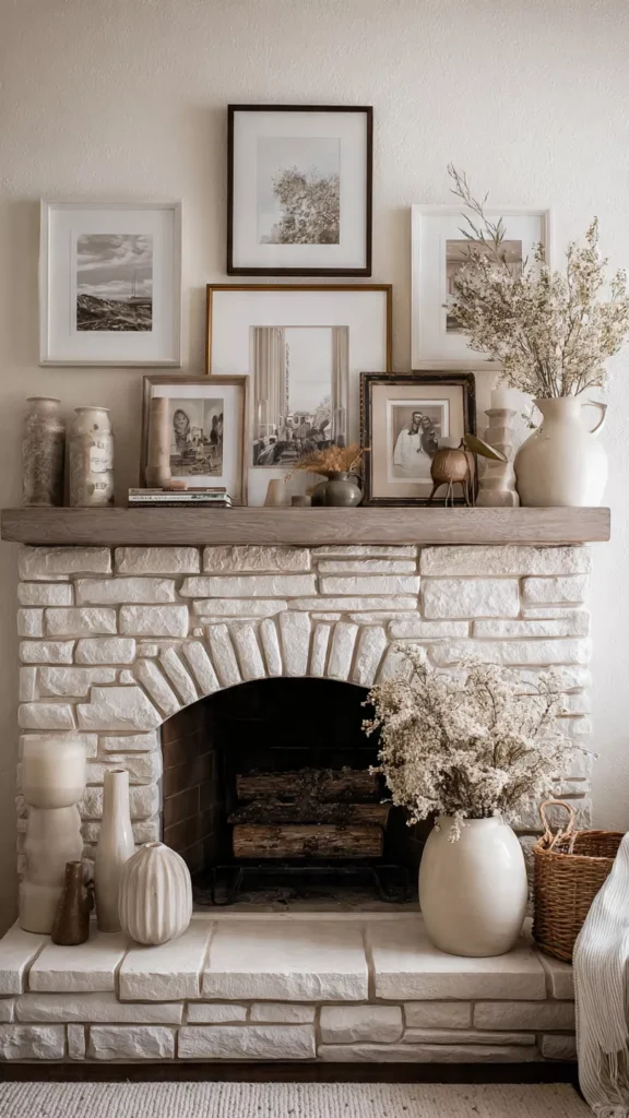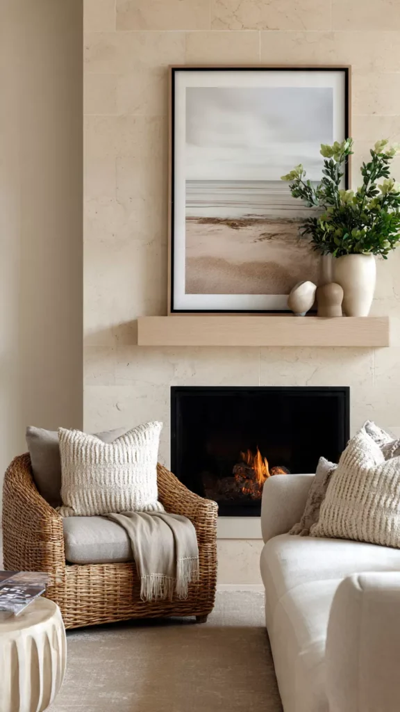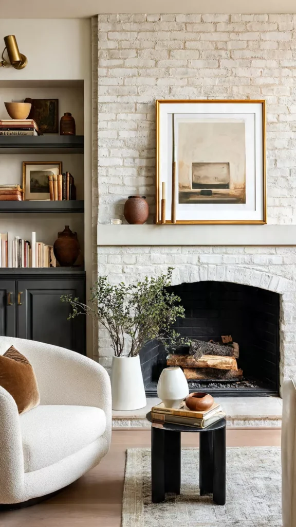 A framed print or painting above the fireplace anchors the space beautifully. The artwork becomes the emotional focal point. I love how art changes the room’s energy. Doesn’t it set the mood instantly?