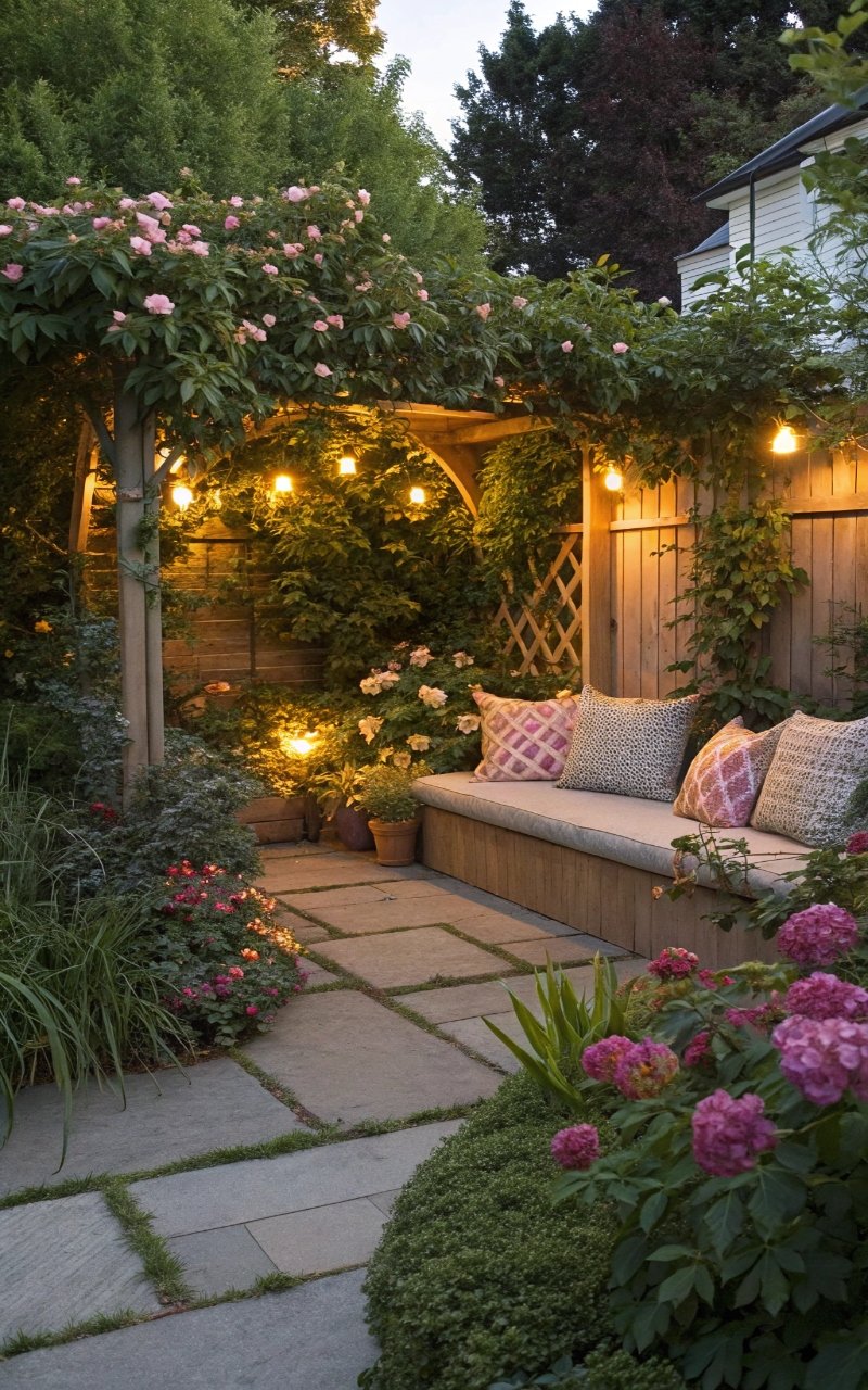 A corner seating area adds coziness. I love small benches with plants. The yard feels inviting. Nothing feels wasted. Doesn’t comfort matter? It’s a retreat.