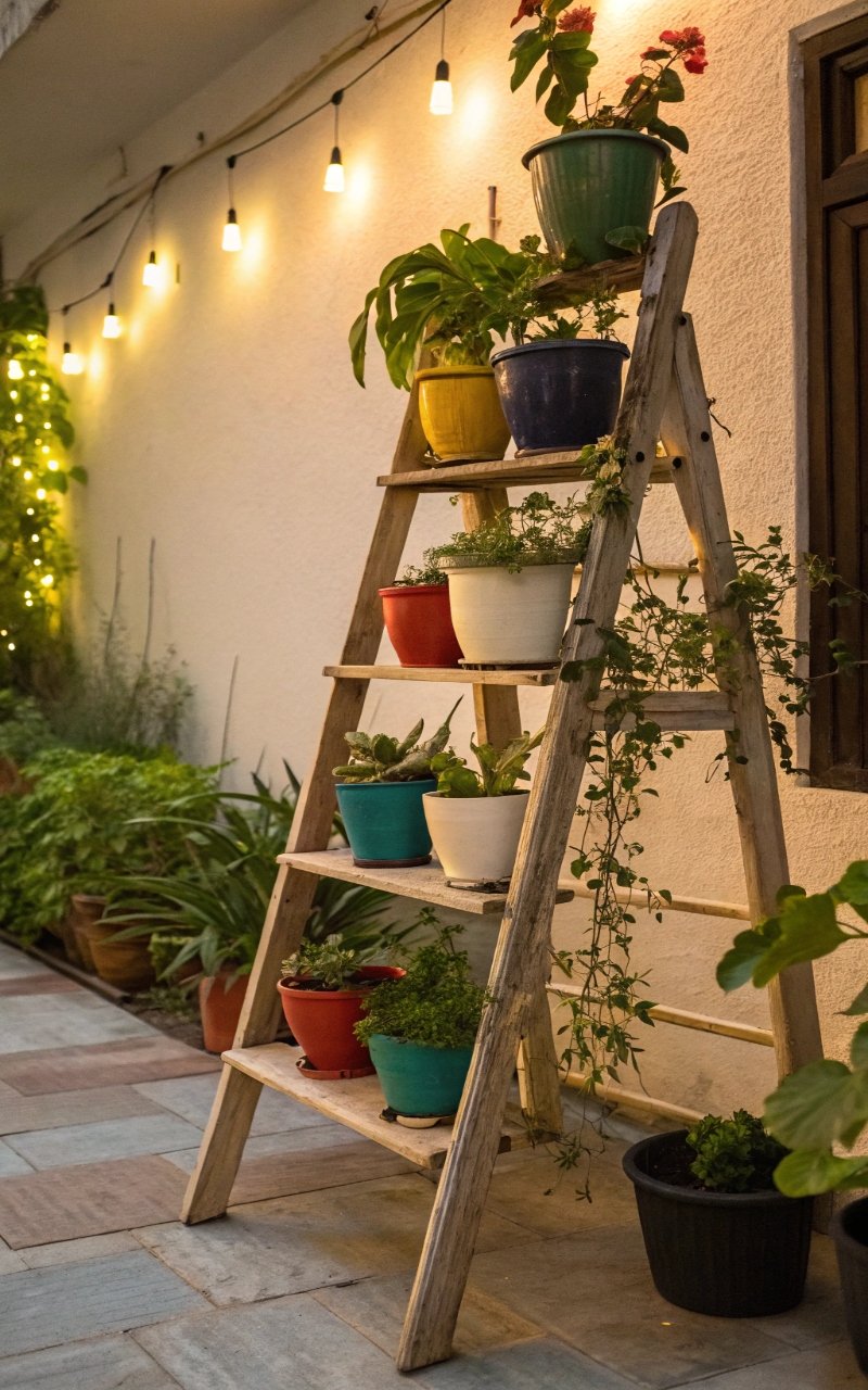 Using a ladder to display pots added height and character instantly. The stepped arrangement and vertical flow create a layered, eye-catching feature. I love how it turns a simple object into something decorative. It feels creative without being complicated. Have you ever used everyday items in unexpected ways? This one makes it work beautifully.