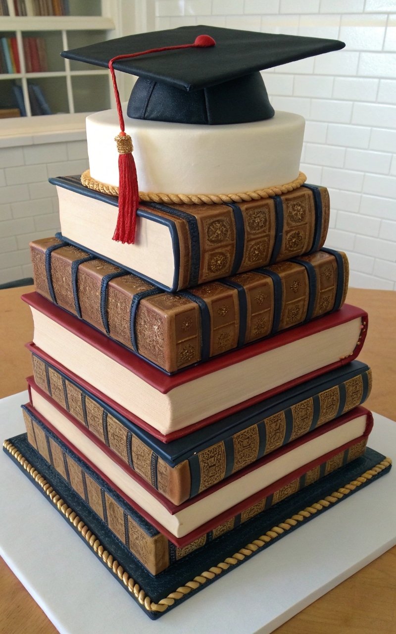 A stack of book cakes adds a fun academic touch. The layered book design and themed details make it playful and creative. I love how it represents the graduate’s journey. It feels meaningful without being too serious. Have you ever used symbolism like this? This one works perfectly.