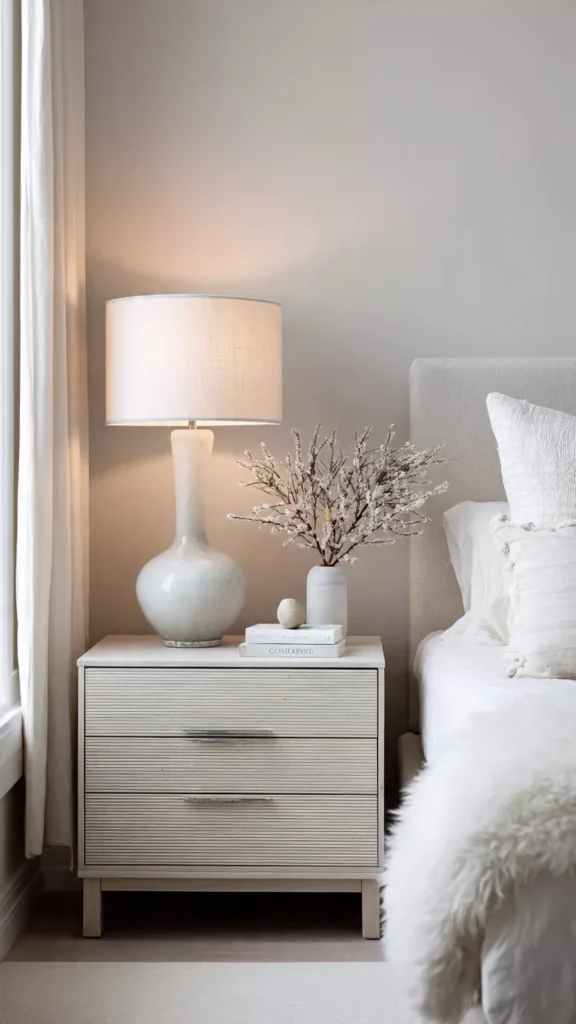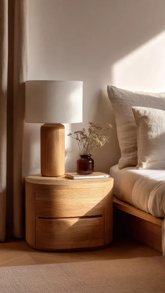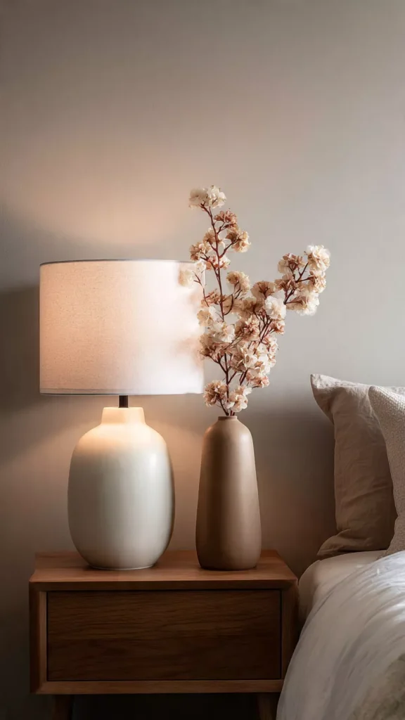 Let your lamp do the talking. A sculptural or softly shaped lamp can instantly anchor the bedside without needing much else. I love how one statement piece creates presence without clutter. Isn’t it refreshing when one item feels “enough”?