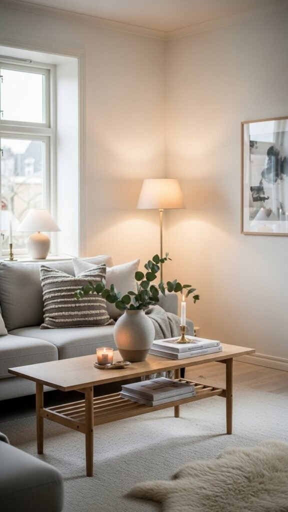 Soft, warm lighting sets the mood in a Scandinavian living room. I love using floor lamps and table lamps instead of harsh overhead lights. The glow feels calm and inviting. It makes evenings feel extra cozy. Doesn’t gentle light feel more relaxing? Lighting changes everything.