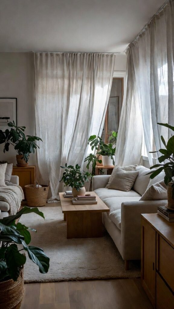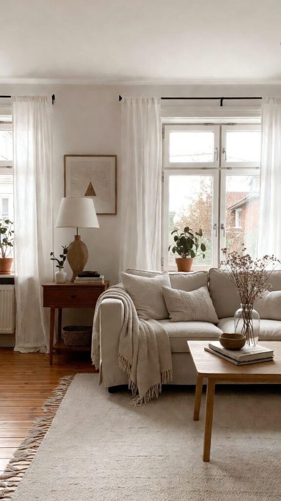 Light curtains or sheer panels let natural light flow through while adding privacy. I love how they move gently in the breeze. The room feels airy and calm. Heavy drapes just aren’t needed here. Doesn’t soft fabric make everything feel more peaceful? It’s a Scandinavian favorite.