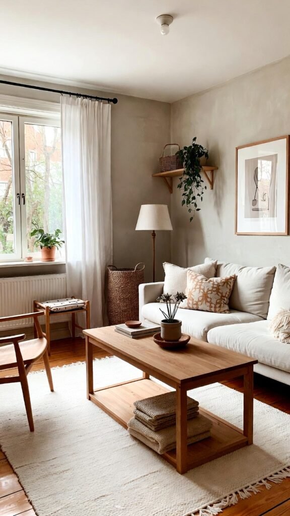 Hidden storage keeps the living room neat and clutter-free. I love how Scandinavian design prioritizes practicality. Cabinets and baskets store essentials while keeping surfaces clean. The room feels peaceful and organized. Doesn’t a tidy space feel more relaxing? It’s all about function.