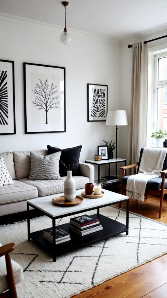 Minimalist wall art adds personality without cluttering the space. I love black-and-white prints or soft abstract designs. They bring interest while keeping the look calm. The walls feel curated rather than bare. Doesn’t subtle art feel more refined? It’s the perfect balance.