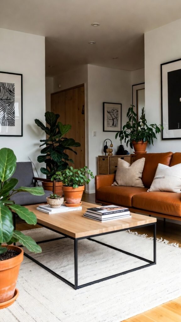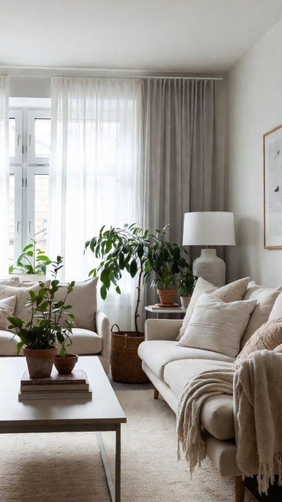 Green plants bring life and color into a minimalist Scandinavian living room. I love how they soften the clean lines and add natural beauty. Even one plant can change the mood. The room feels brighter and happier. Doesn’t greenery make everything feel alive? It’s the perfect finishing touch.