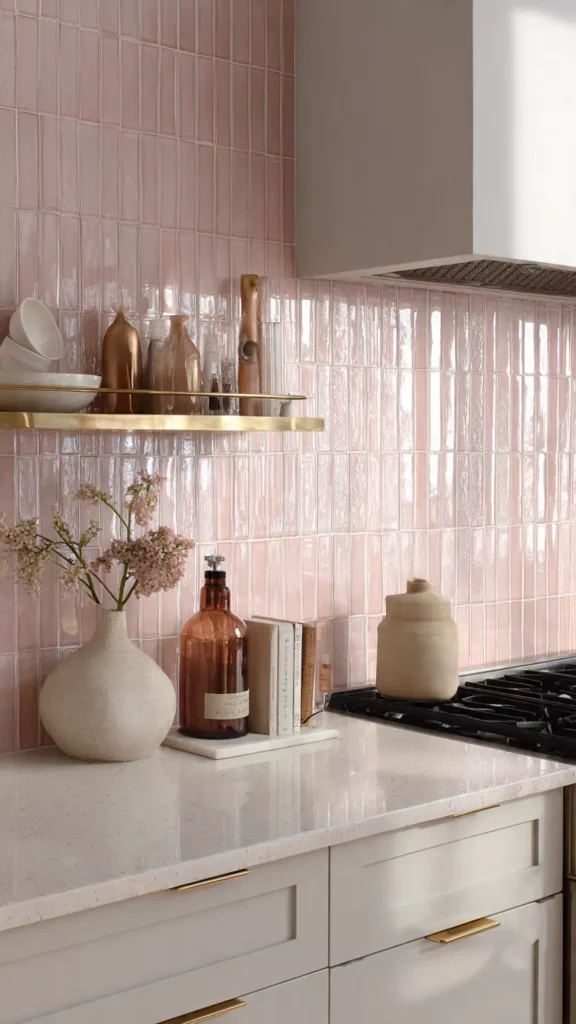 If committing to pink cabinets feels like too much, a pink backsplash offers a perfect middle ground. Zellige tiles, glossy subway tiles, or even terrazzo with pink flecks add personality fast. The backsplash acts like jewelry for your kitchen, catching light and attention. Why not let one area do the talking? It’s an easy way to experiment without regret.