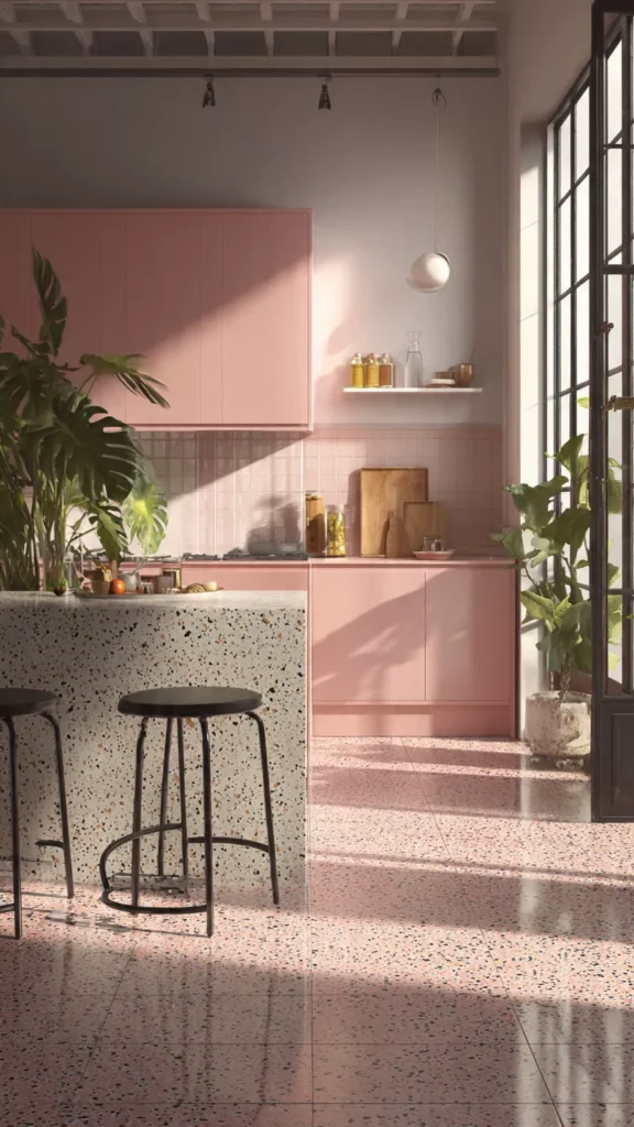 Pink tile floors feel bold, graphic, and surprisingly versatile. When paired with simple cabinetry, they ground the kitchen with character. I’ve seen this done with terrazzo and square tiles, and it always stops me mid-scroll. Isn’t it cool when floors become the star? Pink underfoot feels daring and chic.